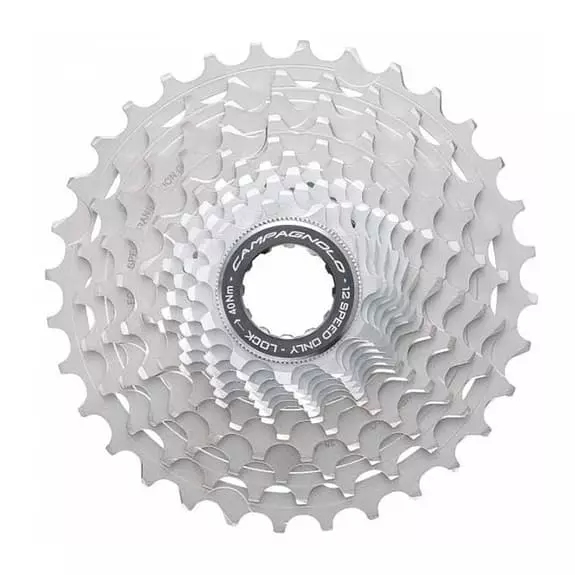 Il pacco pignoni Campagnolo Super Record 12V è altamente innovativo. Grazie alla dimensione complessiva uniforme e alla compatibilità con ruote e telai di diverse dimensioni garantisce moltissimi vantaggi. Questo pacco pignoni aggiunge un pignone in più però mantiene le stesse dimensioni globali e migliora le prestazioni e la durata del componente. I pignoni sono molto più sottili e stretti e le dimensioni generali risparmiano spazio ed equivalgono a quelle del 11V. In questo modo consente di adeguare le necessità dell’utente con solo 2 pacchi pignoni (11-32, 11-29) L’aggiunta del pignone extra aiuta a mantenere una salita o una discesa lineari con un semplice salto del dente alla settima posizione, permettendo così al ciclista di trovare la relazione perfetta in ogni situazione. Lo spazio più ridotto tra pignoni garantisce un cambio più veloce, silenzioso e preciso. I 6 pignoni più grandi garantiscono nelle due triplette in acciaio di evitare perdita di energia. Il montaggio del pacco pignoni è facile grazie ai separatori dello stesso spessore.