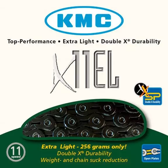Catena KMC X-11 EL Blacktech 118 maglie 11 velocità Top performance per biciclette da strada, con maglie laterali interne ed esterne di peso ridotto.