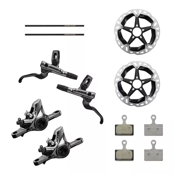 Il kit di freni a disco idrico Shimano XTR M9120 4 pistoni comprende la leva del freno anteriore con tubo flessibile da 1000 mm, la leva del freno posteriore con tubo flessibile da 1700 mm, le pinze del freno con pastiglie e dischi freno con un sistema a 6 bulloni da 160, 180 e 203. Viene consegnato senza spurgo. Concentrandosi sulla riduzione del peso e sulla potenza di frenata in linea con la mountain bike, la leva fornisce una modulazione intuitiva che permette al ciclista di esplorare i propri limiti con sicurezza.