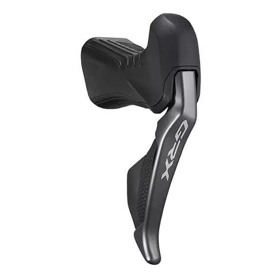 La manopola del freno Shimano GRX RX815 Di2 2×11 per disco freno è progettata ergonomicamente per il Gravel, con un asse girevole 18 mm più alto, un profilo curvo della manopola e una finitura strutturata e antiscivolo che ne consente un utilizzo sicuro su terreni accidentati.