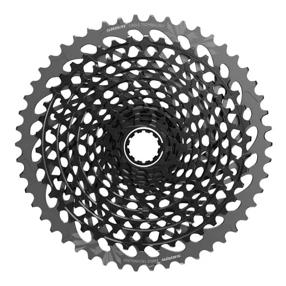 Il pacco pignoni SRAM Eagle XG-1295 a 12 velocità è la parte più spettacolare del nuovo gruppo SRAM Eagle. Il design dei denti è stato aggiornato nella versione X-Glide 2, per ottenere velocità e precisione nella cambiata. La corona da 50 denti è di alluminio e si fissa posteriormente al resto delle corone realizzate in acciaio CroMoly a partire da un unico blocco con la tecnologia X-Dome. Inoltre, è compatibile con il corpetto SRAM XD, con cui non è necessario alcun adattatore. Questa cassetta si differenzia dal modello precedente, XG-1299, unicamente per il colore. In questo caso, è stato scelto il nero anziché il dorato.