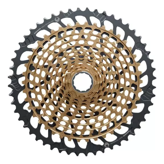 Il pacco pignoni SRAM Eagle XG-1299 a 12 velocità è la parte più spettacolare del nuovo gruppo SRAM Eagle. Il design dei denti è stato aggiornato nella versione X-Glide 2, per ottenere velocità e precisione nella cambiata. La corona da 50 denti è di alluminio e si fissa posteriormente al resto delle corone realizzate in acciaio CroMoly a partire da un unico blocco con la tecnologia X-Dome. Inoltre, è compatibile con il corpetto SRAM XD, con cui non è necessario alcun adattatore.